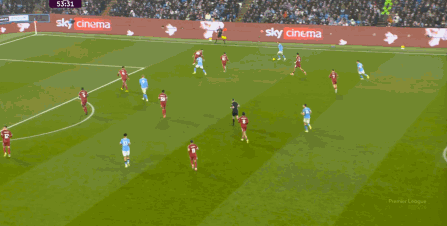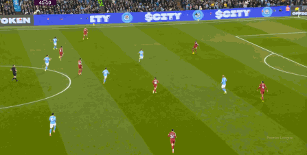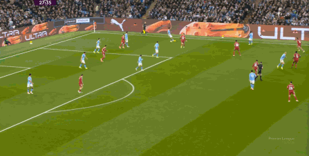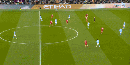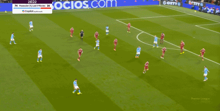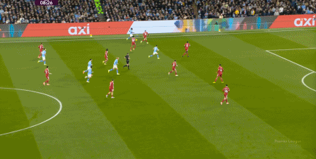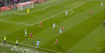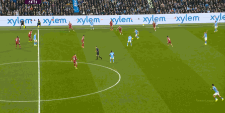 就像第17分钟这次一样,利物浦看似抓住了哈兰德停球过大的问题,但曼城立刻通过小个子球员完成反抢,再一次通过左路的进攻形成了门前的机会: