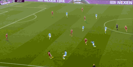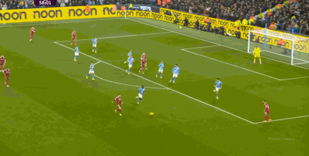 一个非常简单的反制思路,就是在中场区域进行绞杀战术,通过单点上的力量和对抗能力来打出曼城在中场区域的局限,而利物浦其实在上半场末段,就这样得到了最好的一次转化进攻的机会: