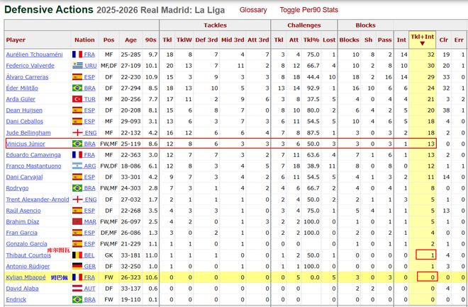 另外还有一个数据,就是姆巴佩本赛季西甲前11轮踢完后,他的抢断和拦截数据依旧是0。要知道哪怕是皇马的门将库尔图瓦,都比姆巴佩多贡献了1次抢断。皇马全队只有3人攻防数据贡献为0,其他两位是出场54分钟的阿拉巴和出场不到10分钟的恩德里克。